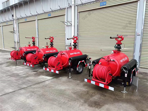 移動干粉滅火裝置,以高壓氮氣為動力,將儲罐內(nèi)干粉滅火劑通過干粉炮或干粉槍噴向保護對象,由于干粉的比重較大,在氣流的作用下能覆蓋到火上不致被氣流沖散。干粉在火焰的作用下破壞了原有的結(jié)晶,以新的化學物質(zhì)中斷了燃燒的鏈式反應,窒息火焰,同時干粉在分解過程中大量吸熱,使著火區(qū)域溫度迅速下降,從而控制撲滅火災。