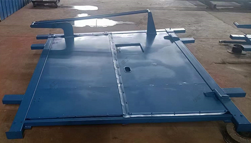 礦用無壓風(fēng)門適用于煤礦井下巷道任何需要安設(shè)風(fēng)門的地點。無壓風(fēng)門采用壓力平衡原理,每道風(fēng)門為雙扇鋼制門框異向同步開閉,運用聯(lián)桿平衡機(jī)構(gòu)把作用在風(fēng)門上的壓力通過聯(lián)桿平衡機(jī)構(gòu)轉(zhuǎn)化為一種內(nèi)力并得到平衡,保證了風(fēng)門打開時省力、方便靈活。由于壓力平衡式風(fēng)門為異向開閉,因此無論風(fēng)流方向如何,兩扇門均同時受到風(fēng)流的推力和風(fēng)流的壓力,而且大小相等。另外在門框橫梁上的風(fēng)門開啟方向的異側(cè),焊接擋板確保風(fēng)流反向時風(fēng)門不被吹開。同時通過配重塊產(chǎn)生的牽引力實現(xiàn)風(fēng)門自動關(guān)閉。